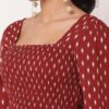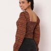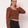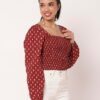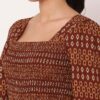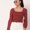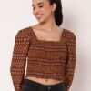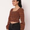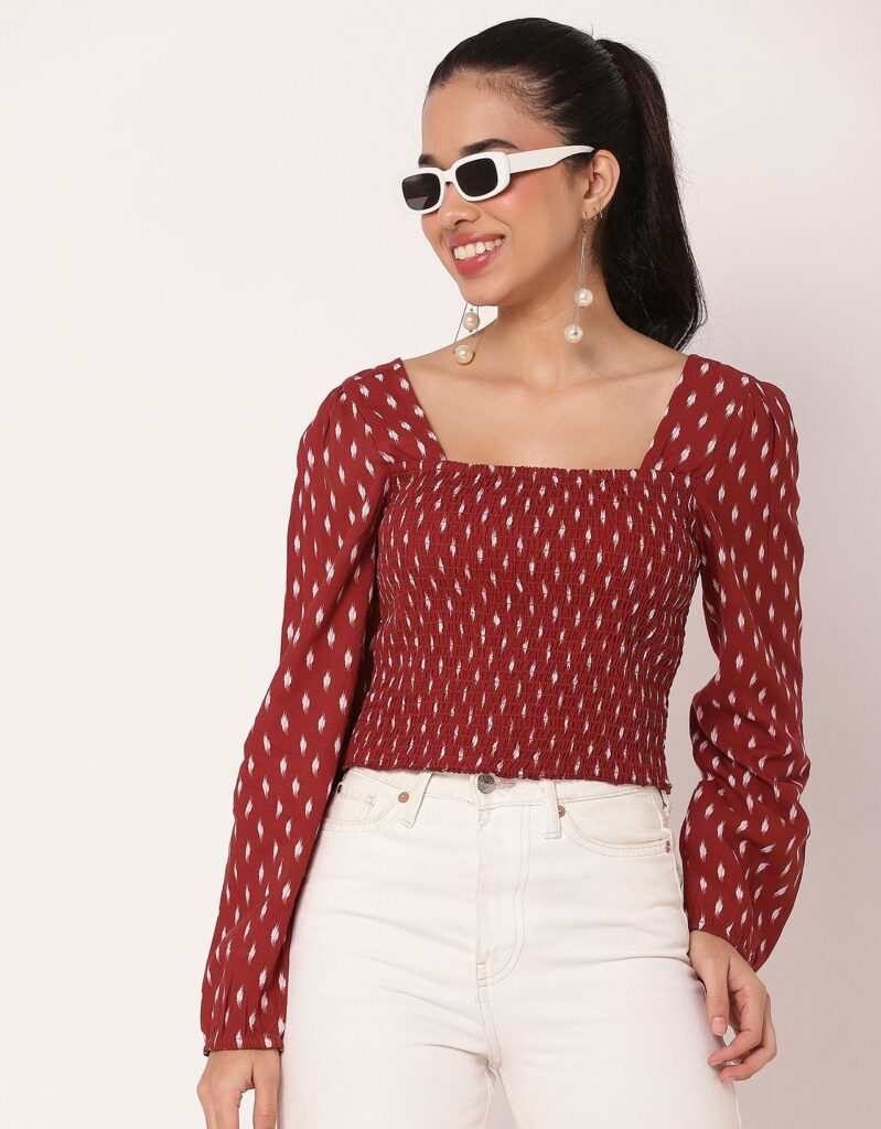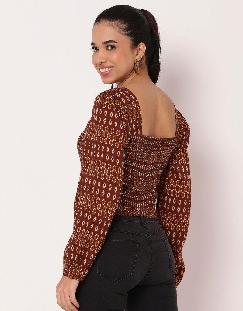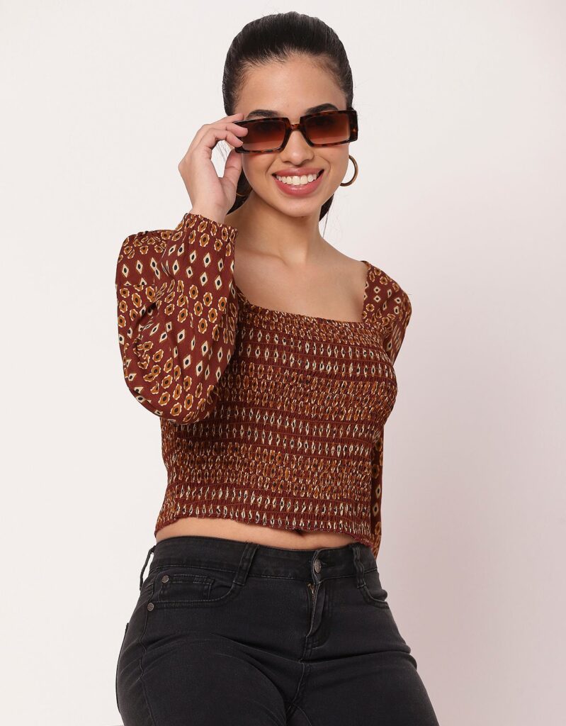Features: Smocked, balloon sleeves, square neck, cropped size, light weighted and all over printed pattern
