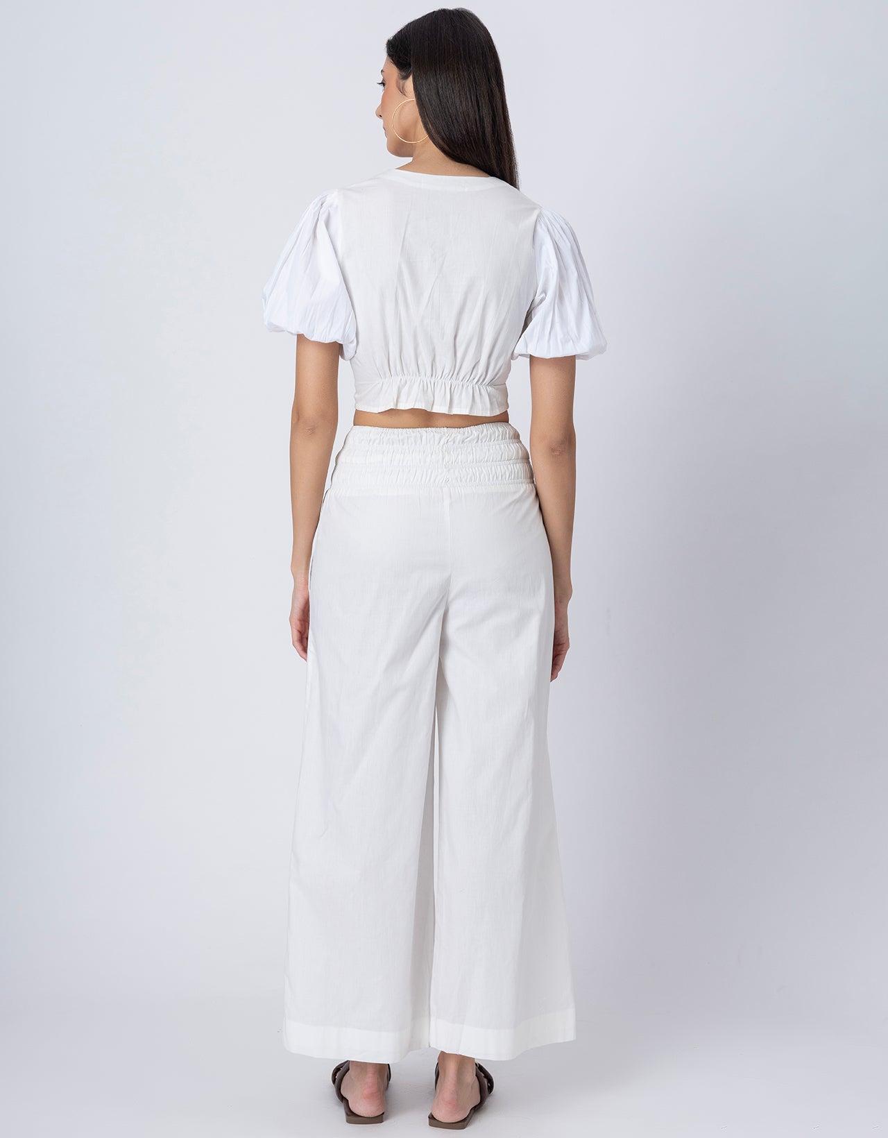 Features: This V-neck 2-Piece Cotton Co-ord Set features a stylish crop top with puffed sleeves and elastic detailing on the front and back, paired with flared palazzo pants that have an elastic waist with a drawstring, offering a relaxed fit, lightweight comfort, and two convenient pockets.