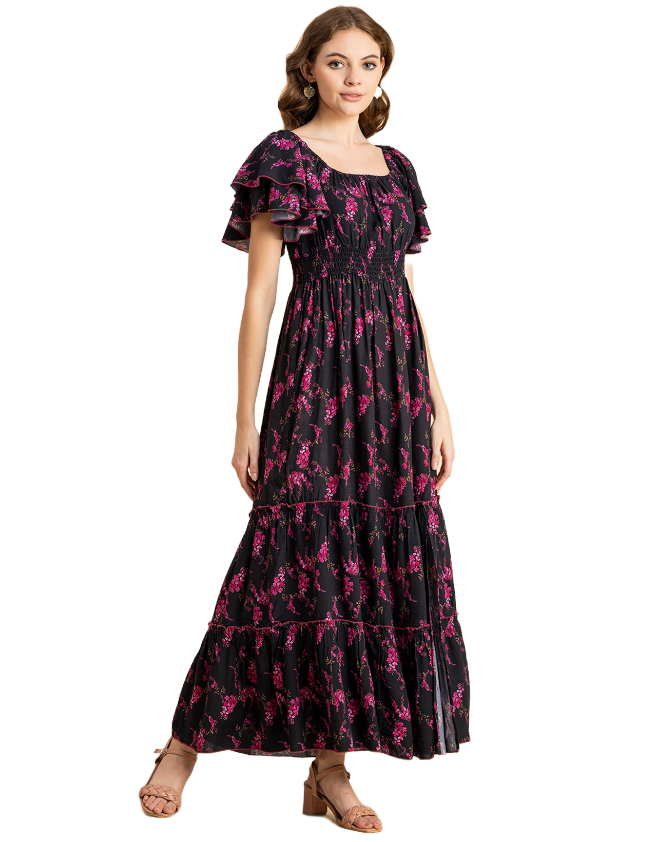 Tags: Slit Dress For Women, Printed Dresses For Women, Tiered Dress For Women, Printed Maxi Dress For Women, Short Sleeve Dress, Square Neck Long Dress, Vacation Dress For Women