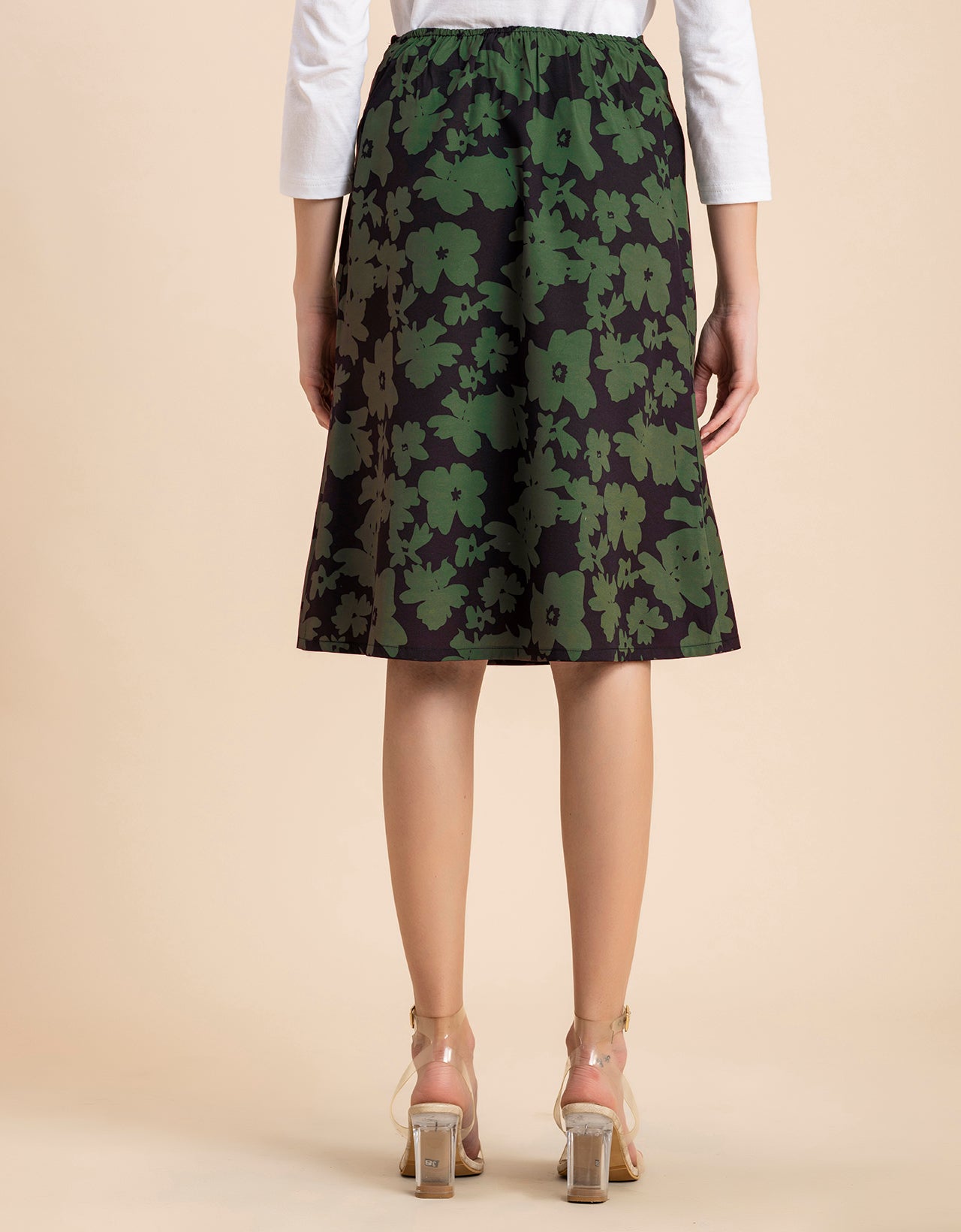 Features: Elastic Waist, Flared Hem, A-Line, Concealed Zipper, Comfortable, Regular Fit, All Over Printed Pattern.