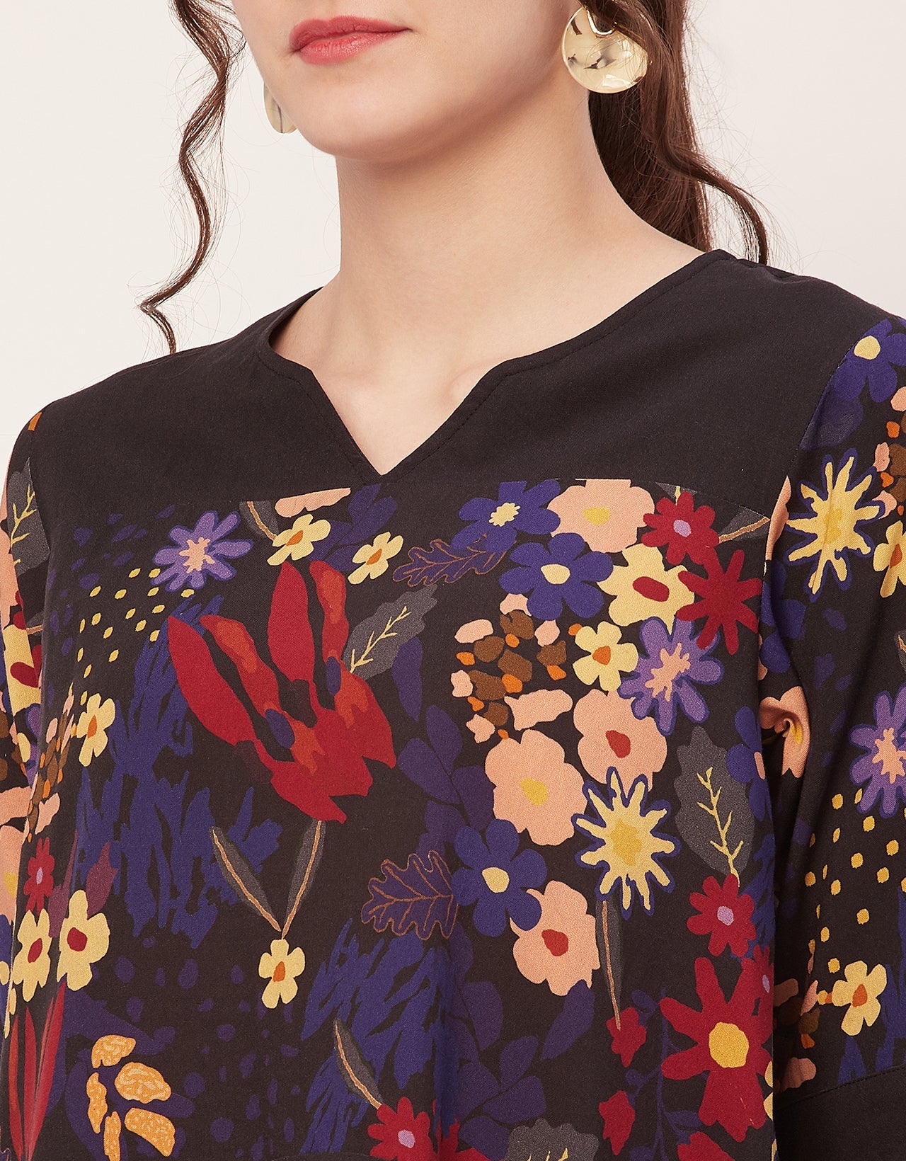 Features: Round Neck With V Cut, 3/4Th Sleeve, Tunic Length, Lightweight, All Over Printed Pattern.