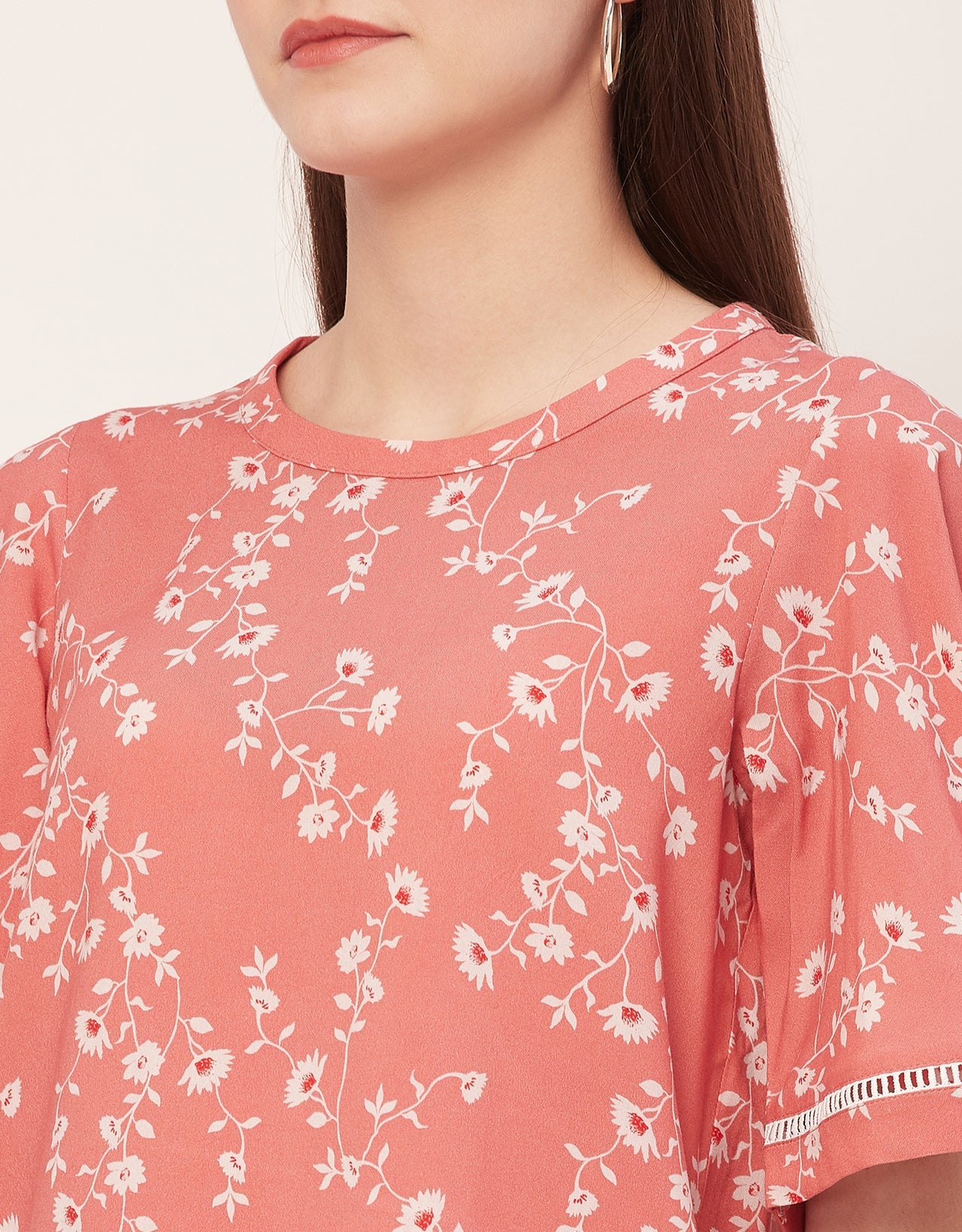 Features: Short Sleeve, Round Neck With Keyhole, Short Flutter Length With Lace Details, Lightweight, All Over Printed Pattern.